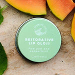 The SunButter Skincare Restorative Lip Gloss combines nourishing Castor and Jojoba oils with soothing Paw Paw and Peppermint. This hydrating formula features Cacao Butter, Carnauba Wax and Vitamin E for lasting moisture. Perfect for sun-exposed lips, this vegan balm comes in a reusable tin for sustainable, on-the-go care.