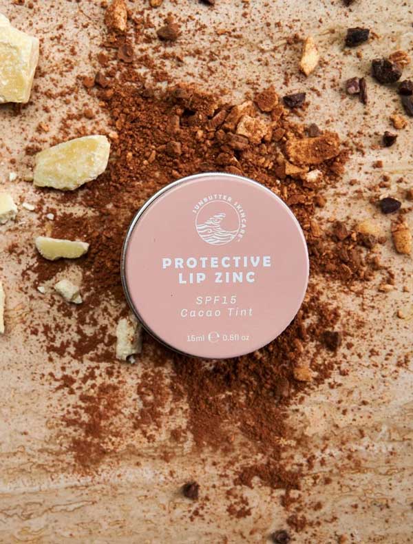 The SunButter Skincare SPF15 Protective Lip Zinc in Cacao Tint combines non-nano zinc oxide with hydrating Australian botanicals. This protective formula features organic Cocoa Butter, Castor Oil and Tasmanian Kelp Extract for lasting moisture, while providing a natural hint of colour. Made in Australia and vegan.