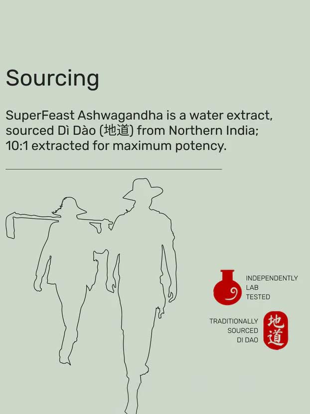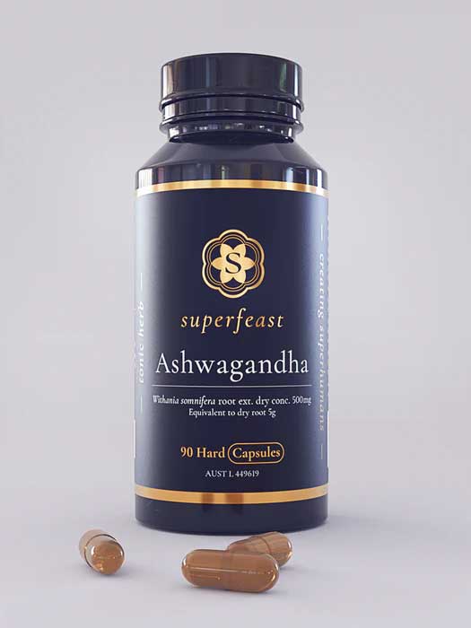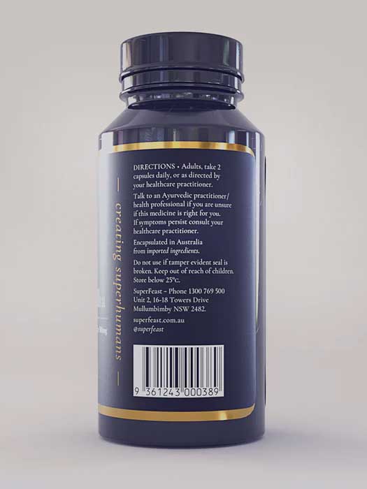 SuperFeast Ashwagandha Capsules contain one of the most important herbs in the Ayurvedic tradition, treasured for over 6,000 years for its ability to revitalise and rejuvenate. This potent Indian root strikes a delicate balance between strengthening the body while bringing calm, parasympathetic embodiment. Used traditionally to promote healthy sleep patterns, support reproductive hormones, and foster a healthy stress response, ashwagandha meaning "smell of horse," referring to both its aroma and strength-giving properties holds a similar place in Ayurvedic medicine as ginseng does in the Chinese system, though with a softer energy. These convenient capsules deliver SuperFeast's exceptional water-extracted ashwagandha, sourced Dì Dào from Northern India for maximum potency and efficacy. Lab-tested for purity. Made in Australia, packaged in glass. TGA Listed (AUST L ). ALWAYS READ THE LABEL. FOLLOW THE DIRECTIONS FOR USE.