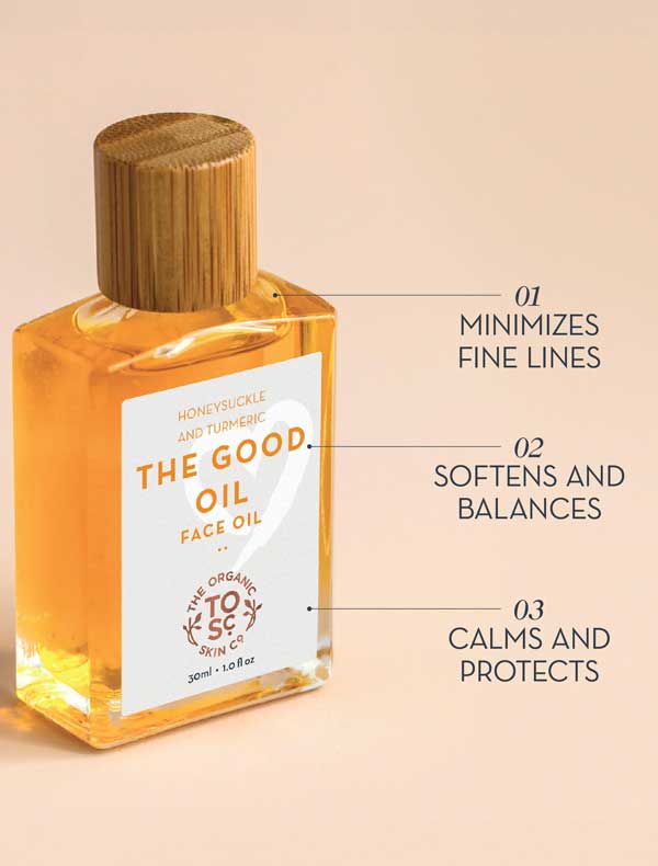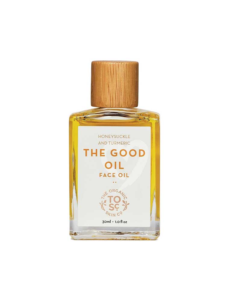 The Organic Skin Co The Good Oil combines CO2-extracted Turmeric, Calendula, Honeysuckle and Rosemary with four replenishing organic oils. This silky formula features nourishing Jojoba, Sweet Almond, Avocado and Evening Primrose oils to deeply moisturise and restore all skin types. Perfect for dry or mature skin, this luxurious face oil absorbs easily while carrying sweet honeysuckle notes and helping to promote a healthy, radiant complexion. Made in New Zealand, certified organic, vegan and packaged in glass.