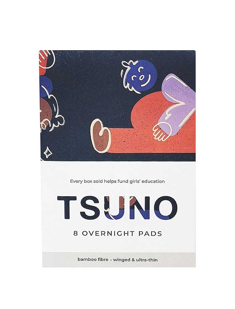 Tsuno Overnight Pads provide exceptional protection with their generous 350mm length, specifically designed for worry-free sleep during your period. These ultra-thin pads feature wings for secure placement and a natural bamboo fibre top sheet that's soft and breathable with a super absorbent inner core for managing heavier flow throughout the night. Each purchase supports Tsuno's mission as a social enterprise, with 50% of profits donated to charities focused on empowering women through education and menstrual support initiatives worldwide. Made from sustainable bamboo, Chlorine and dioxin bleach free, Biodegradable films and wrappers, Social Traders Certified social enterprise.