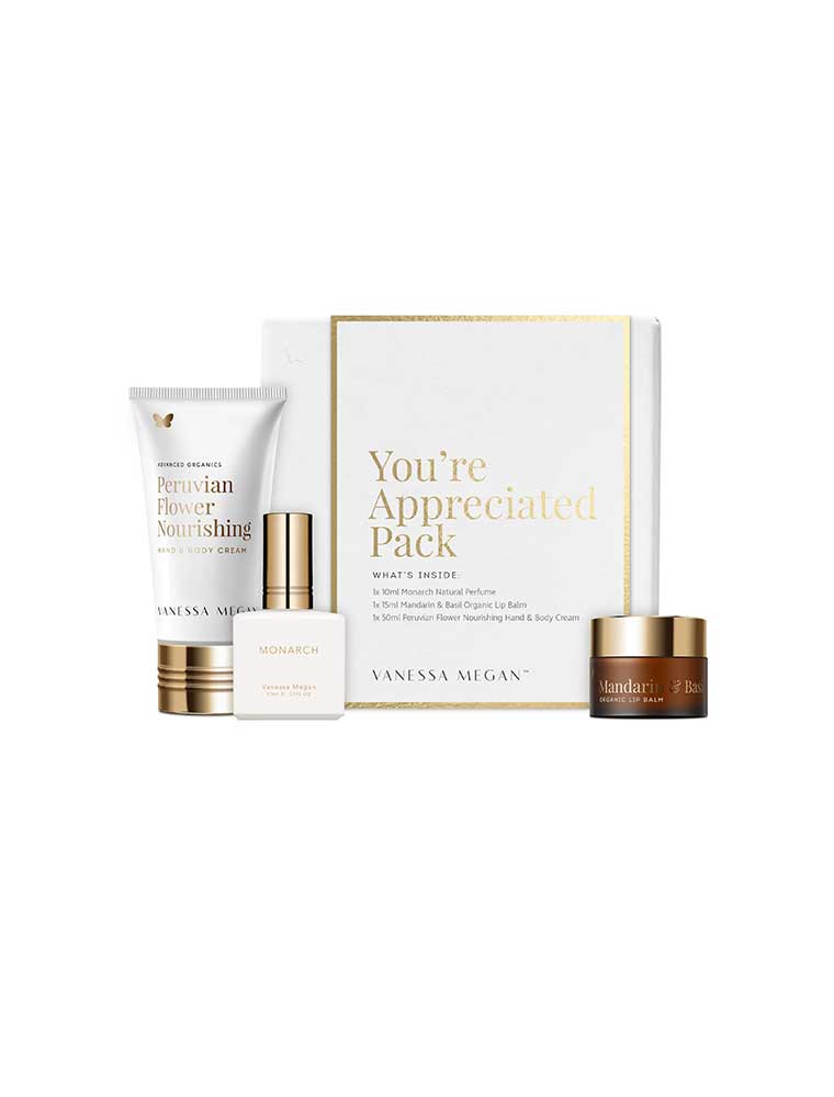 Monarch Natural PerfumeIonised Aqua, Lavandula Angustifolia [Bulgarian Lavender] Oil, Cananga Odorata [Ylang Ylang] Essential Oil, Pelargonium Capitatum [Geranium] Leaf Oil, Pogostemon Cablin [Patchouli] Essential Oil, Rosa Damascena [Rose Absolute] Oil, Australian Sea Salt, Decyl Glucoside, Limonene, Linalool, Citronellol, Geraniol, Eugenol, Farnesol.Mandarin & Basil Organic Lip Balm100% Natural & Organic - *Helianthus Annuus [Sunflower] Seed Oil, *Butyrospermum Parkii [Shea] Butter, *Simmondsia Chinensis [Jojoba] Seed Oil, Euphorbia Antisyphilitica [Candelilla] Wax, *Theobroma Cacao [Cocoa] Seed Butter, *Ricinus Communis [Castor & Black Castor] Seed Oil, Sodium Hyaluronate [Hyaluronic Acid], *Calendula Officinalis [Calendula] Oil, Citrus Reticulata [Mandarin] Peel Essential Oil, *Ocimum Basilicum [Basil] Essential Oil, Tocopheryl Acetate [Natural Vitamin E], Limonene, Linalool, Citral, Eugenol. *Certified Organic IngredientsPeruvian Flower Nourishing Hand & Body Cream100% Natural & Organic - Aqua, Cetearyl Olivate [Olive Emulsifier], Sorbitan Olivate [Olive Emulsifier], *Helianthus Annuus [Sunflower] Seed Oil, *Cocos Nucifera [Coconut] Oil, *Simmondsia Chinensis [Jojoba] Seed Oil, *Theobroma Cacao [Cocoa] Seed Butter, *Butyrospermum Parkii [Shea] Butter, *Citrus Reticulata [Mandarin] Essential Oil, Glyceryl Caprylate, *Glycerin, Xanthan Gum, *Vanilla Planifolia [Vanilla Bean] Extract, *Lavandula Angustifolia [Lavender] Essential Oil, *Pogostemon Cablin [Patchouli] Essential Oil, Limonene, Linalool, Citral, Geraniol. *Certified Organic Ingredients