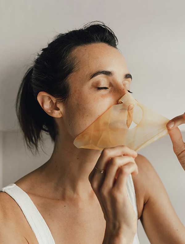 Before opening the bag, use your fingertips to gently distribute the serum evenly. Open a bag, remove the mask and carefully unfold. Remove and discard one of the protective outer layers. Place the bio-cellulose coconut membrane onto the face, adjusting the eye, nose and mouth openings as needed. Remove the second protective layer. Gently smooth the mask over the entire face, eliminating any folds or air pockets. Leave a mask for 15-20 minutes before removing and discarding. Gently pat any remaining serum into the skin. No rinsing necessary.