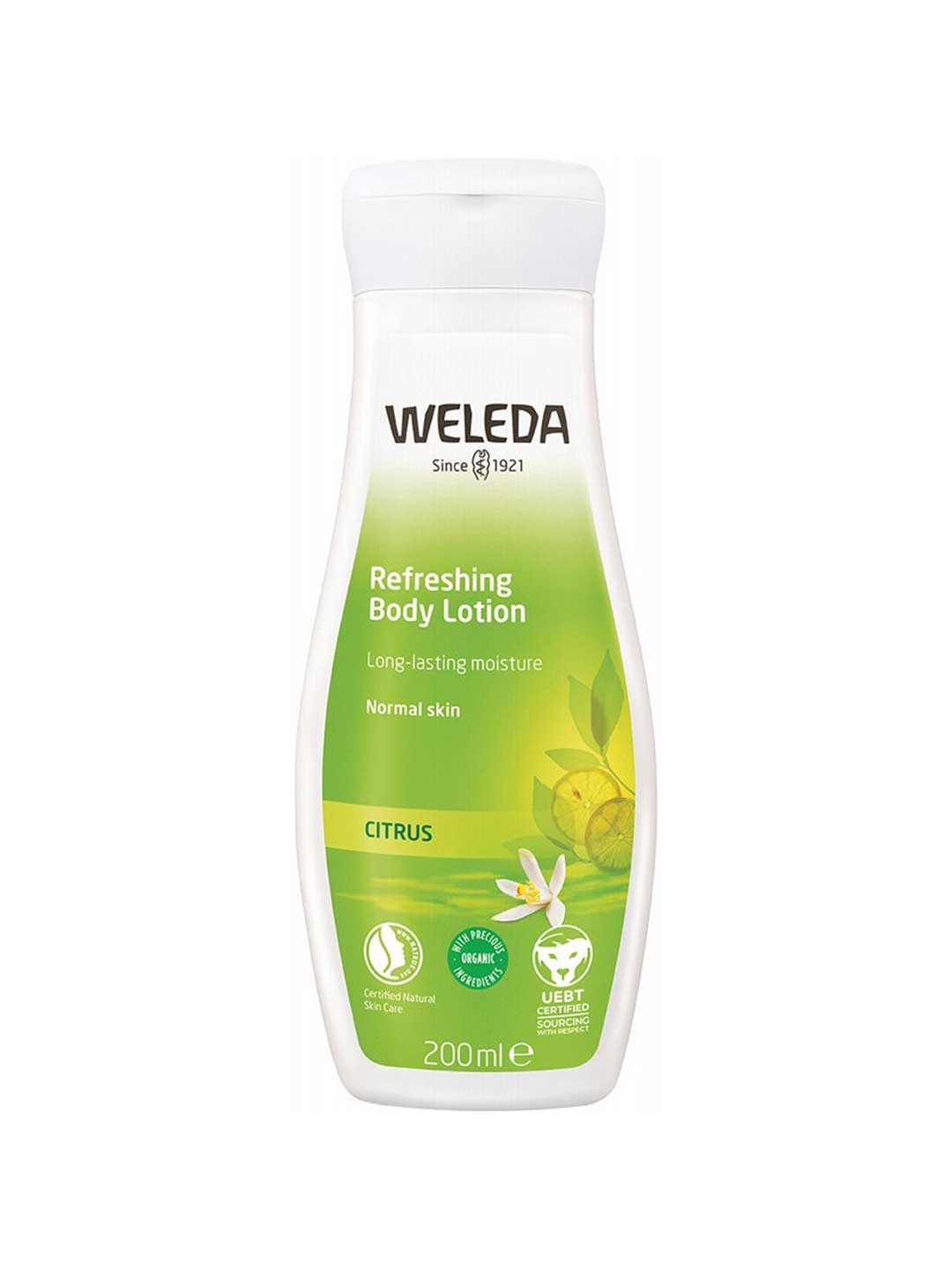 The Weleda Refreshing Body Lotion Citrus is a light and fast-absorbing lotion that gives instant refreshment and long-lasting moisture for all skin types. Formulated with organic Aloe Vera leaf juice and Coconut Oil, this quickly absorbing, non-greasy formula leaves skin soft and comfortable all day. The uplifting fragrance of sun-ripened lemons provides instant refreshment while the formula delivers 24hr immediate and long-lasting moisture. In clinical studies, results showed 98% immediate skin moisture, 90% agree the lotion provides noticeably long-lasting hydration, and 80% agree skin feels light and refreshed. Made in Germany, certified natural and vegan.