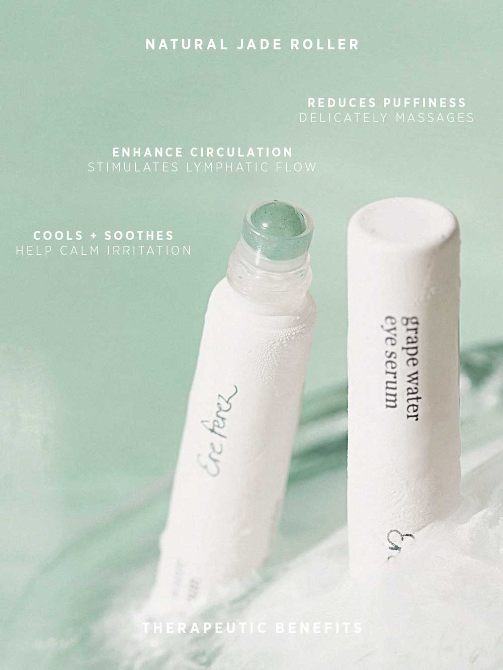 The Ere Perez Grape Water Eye Serum combines peptides with hydrating Grape Water and Hyaluronic Acid to help tired eyes look brighter, firmer and more awake. This lightweight serum features peptides that support the skin's natural collagen production to help diminish the appearance of fine lines, while Liquorice Root helps soothe and improve skin elasticity. The innovative jade-stone roller ball provides a cooling sensation that helps reduce the appearance of puffiness and enhances product absorption. Perfect for daily use morning and night, this gentle serum is specially designed for the delicate under-eye area and creates a smooth base for makeup application. Vegan.