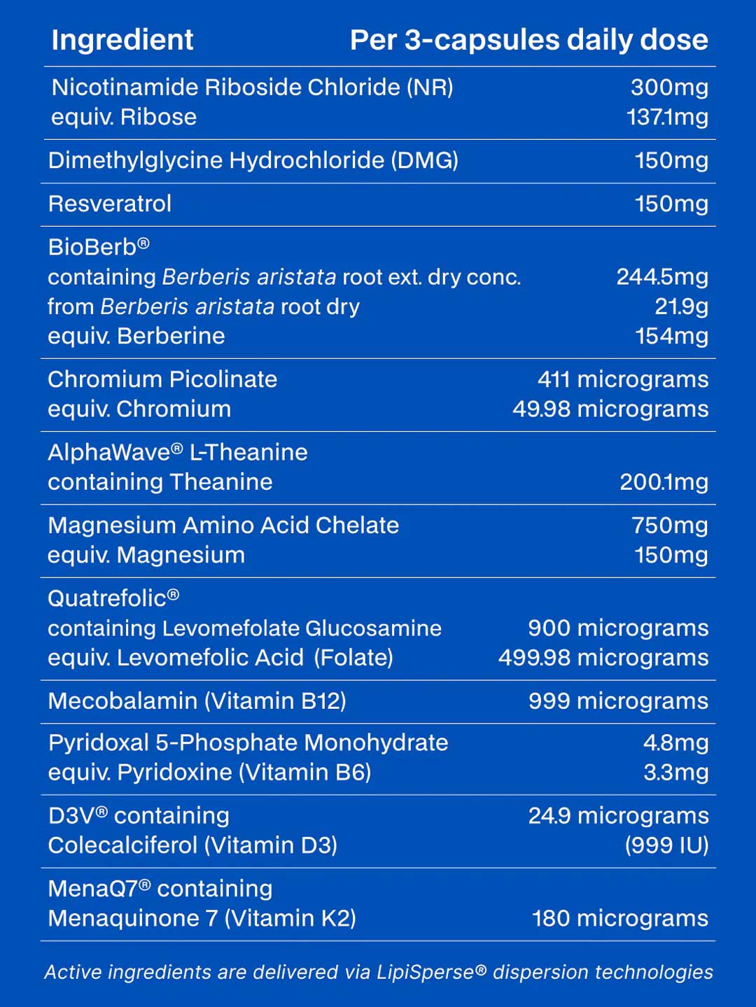 • Combines NR, Resveratrol, Berberine and 9 researched ingredients