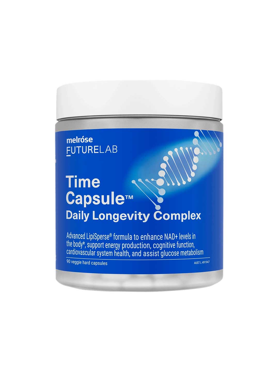 The Melrose FutureLab Time Capsule Daily Longevity Complex is an all-in-one formula combining Nicotinamide Riboside Chloride, Resveratrol, Berberine, L-Theanine and nine additional researched ingredients to support healthy ageing. This multi-nutrient blend helps maintain energy levels, mental clarity, carbohydrate metabolism, bone health, immune function and cardiovascular system health. Formulated with LipiSperse and VeriSperse absorption technologies for enhanced bioavailability. Made in Australia. TGA Listed (AUST L 491947). ALWAYS READ THE LABEL AND USE ONLY AS DIRECTED. If symptoms persist, talk to your health professional. 60 Hard Veggie Capsules, 30 Day Supply