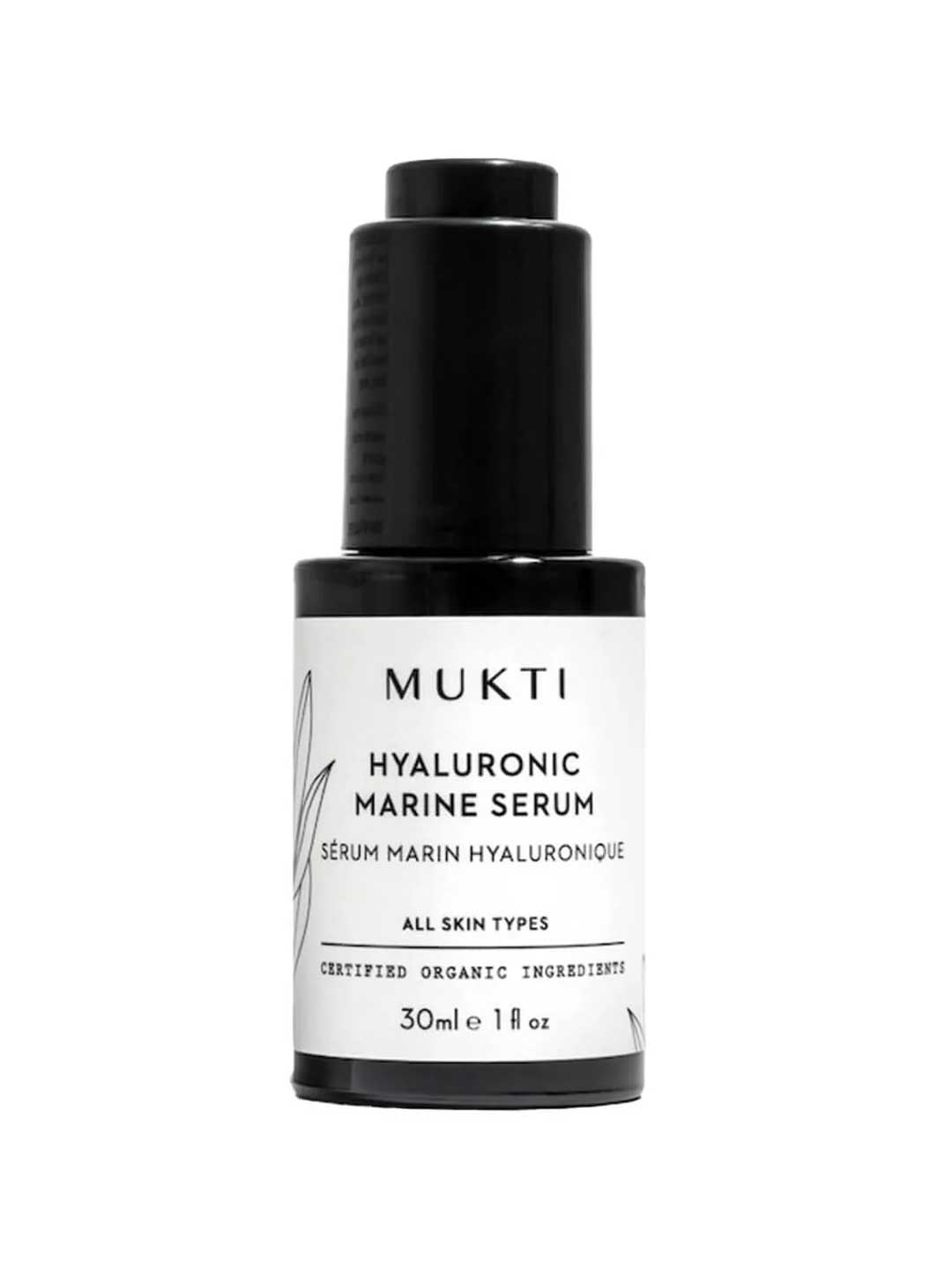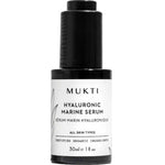 The Mukti Hyaluronic Marine Serum is a hyaluronic acid serum for all skin types that delivers instant hydration whilst improving skin smoothness and luminosity with an advanced Hyaluronic Acid complex and beneficial marine ingredients. This lightweight organic formula contains full-spectrum pure Hyaluronic Acid combined with Wakame Seaweed, rich in vitamins and minerals, and soothing Blue Tansy oil to support the skin's natural moisture balance. Delivering hyaluronic acid benefits including improved skin firmness, reduced appearance of fine lines and enhanced luminosity. Free from silicone and mineral oil. Made in Australia, vegan and packaged in biophotonic glass.