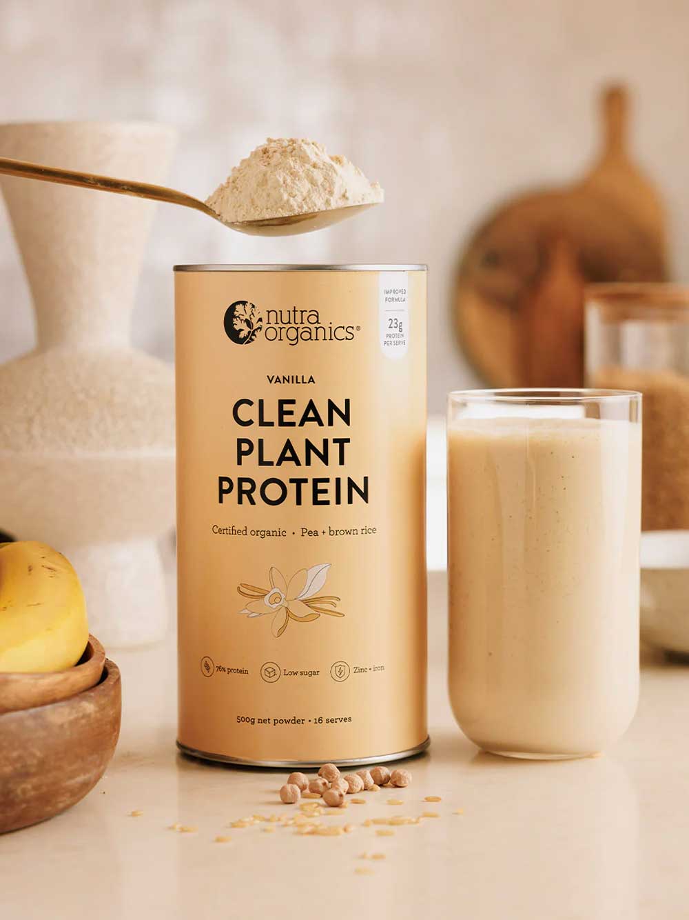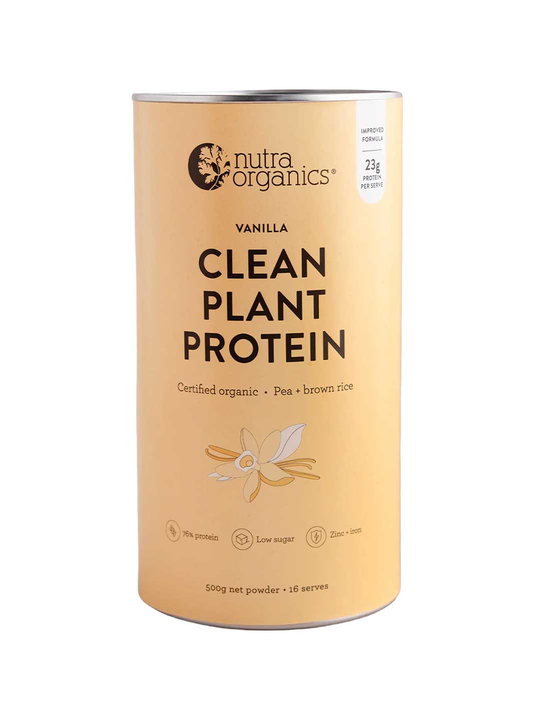 The Nutra Naturals Clean Plant Protein Creamy Vanilla is a delicious, creamy, complete plant protein blend to help you build, tone and repair muscle. Made with the purest certified organic ingredients, this plant protein powder contains hydrolysed smooth pea and brown rice proteins to provide a complete amino acid profile with naturally occurring BCAAs, iron, zinc and phosphorus to support electrolyte balance, recovery, protein synthesis and strength. With 23g protein per serve, this vegan and certified organic plant protein supports muscle building and repair, gut wellbeing and energy for the whole family. A sweet vanilla flavour with a smooth finish.