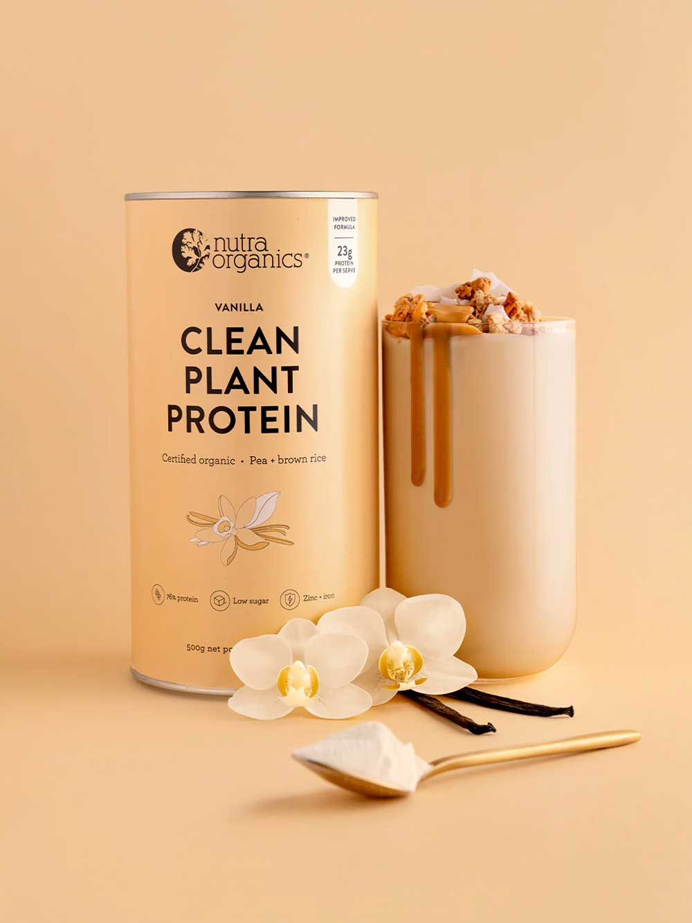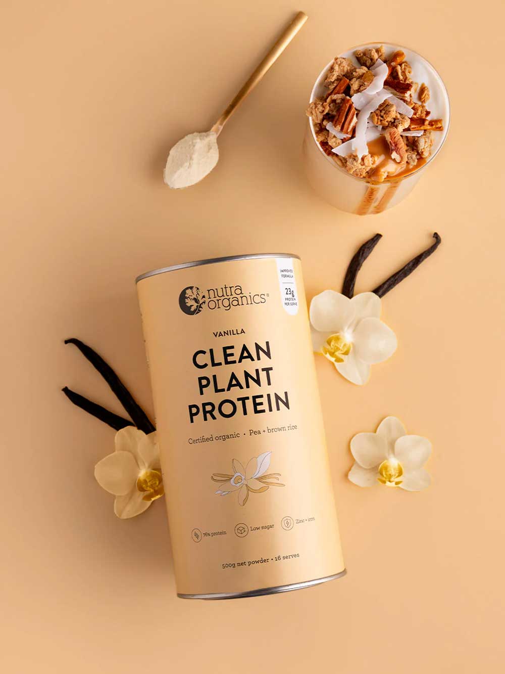 A creamy vanilla plant protein powder with 23g protein per serve from certified organic pea and brown rice to support muscle building and toning.