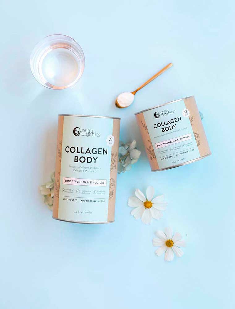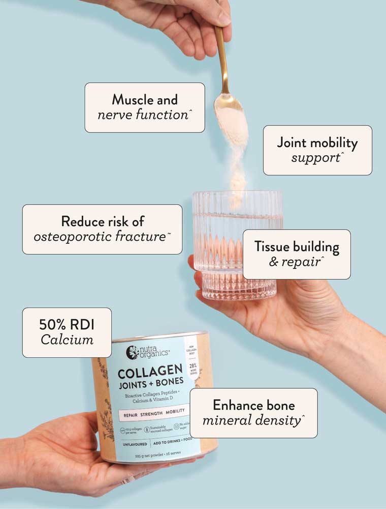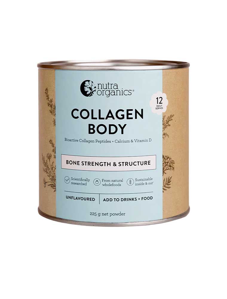 The Nutra Organics Collagen Body (Joints + Bones) is a natural wholefood formulation with ingredients traditionally associated with bone and joint health. Featuring FORTIGEL® Bioactive Collagen Peptides, vitamin D from organic white button mushroom, and calcium from arctic sea algae, this supplement provides nutrients that complement an active lifestyle. Collagen is naturally present in skin, muscles, bones, joints, and connective tissue, with levels typically decreasing from our mid-20s. This unflavoured and versatile powder can be added to almost any food or drink without affecting taste, making it convenient for both active individuals and mature adults as part of their daily wellness routine.