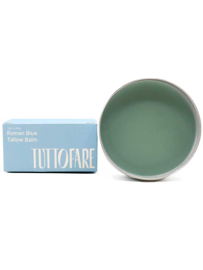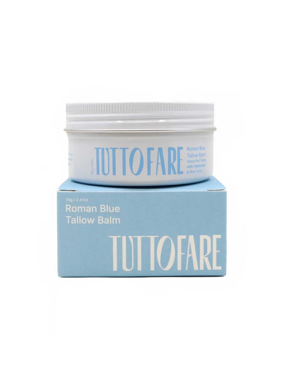 The Tuttofare Roman Blue Tallow Balm combines the nourishment of a rich balm with the smooth finish of a lightweight cream. Made with 100% Australian Grass-Fed and Finished Beef Tallow, Jojoba Oil and Olive Squalane, it mimics the nutrients found in healthy skin to help maintain softness and balance. Blue Tansy and Roman Chamomile calm and comfort the skin, while natural fatty acids and fat-soluble vitamins support a hydrated, radiant complexion. Loved by all skin types, including sensitive and combination skin, this pure, waterless balm melts beautifully into the skin to restore glow and comfort. Made in Australia and plastic free.