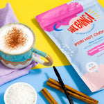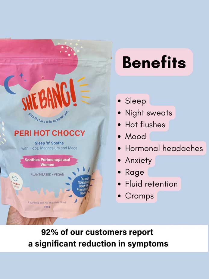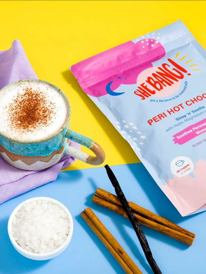 The SheBANG! Peri Hot Choccy Sleep ’n’ Soothe is a functional hot chocolate blend created by a clinical nutritionist to support the hormonal ups and downs of PMS and perimenopause. Formulated with Magnesium Glycinate, Hops and antioxidant-rich Belgian cocoa, this calming blend is designed to help settle the body and mind at the end of the day. With just 40 calories per serve, it offers a naturally decadent chocolate flavour without refined sugar, fillers or artificial ingredients. Magnesium Glycinate helps support deep, restorative sleep and relaxation, while Hops and wholefood botanicals like Maca Root, Vanilla and Cinnamon add warmth, nourishment and subtle sweetness. Each serve provides 60 percent of your recommended daily intake of Magnesium. This easy-to-make bedtime ritual can be enjoyed on its own or blended with your favourite milk for extra creaminess. Made in Australia with all natural ingredients.