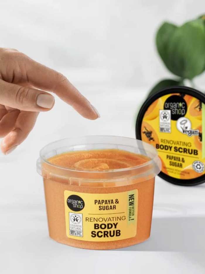 The Organic Shop Papaya and Sugar Renovating Body Scrub combines organic papaya extract with natural sugar crystals to exfoliate, renew and soften the skin. Papaya helps brighten and refresh, while sugar provides a gentle polishing effect for a smooth, healthy-looking glow.