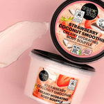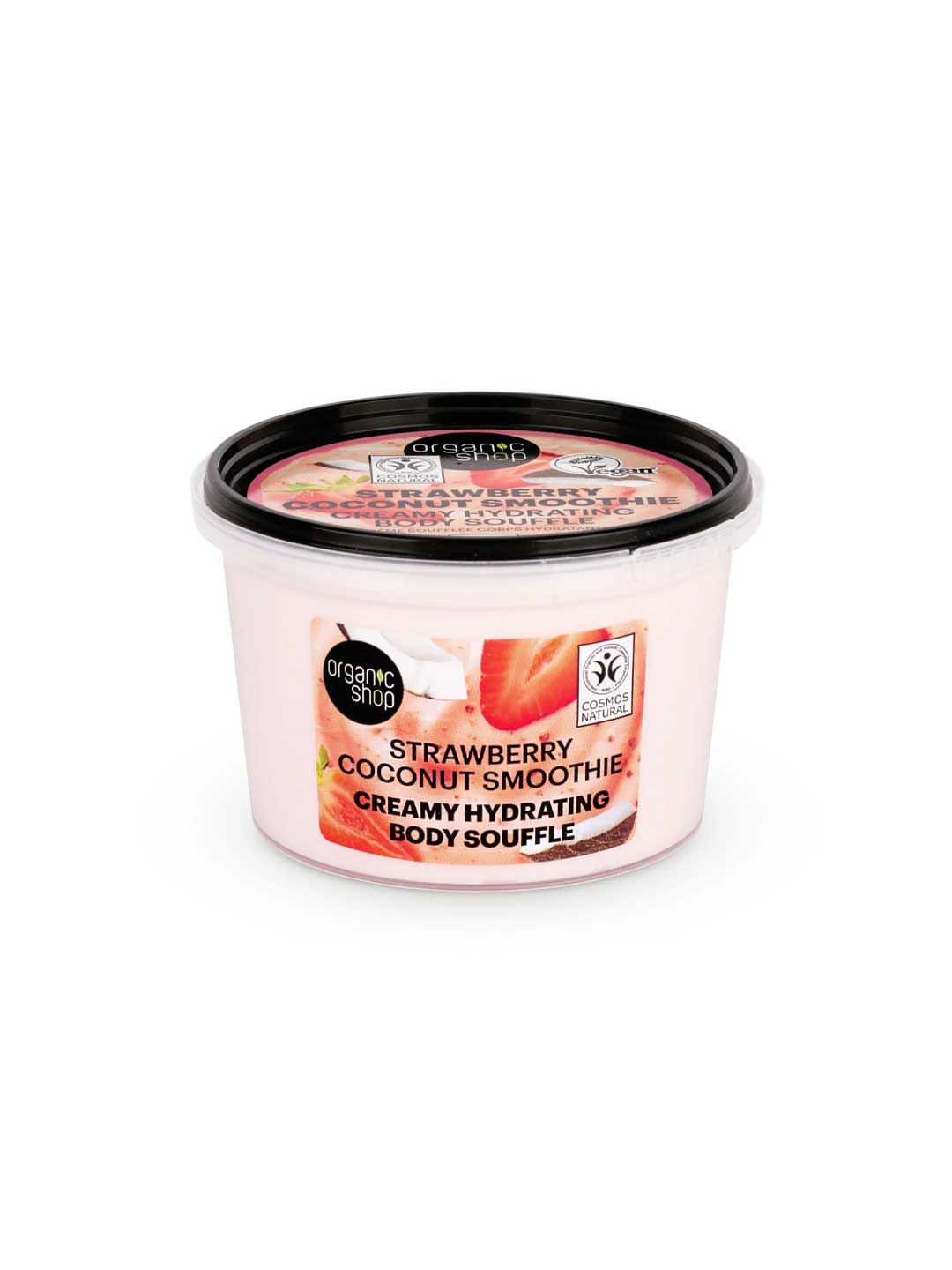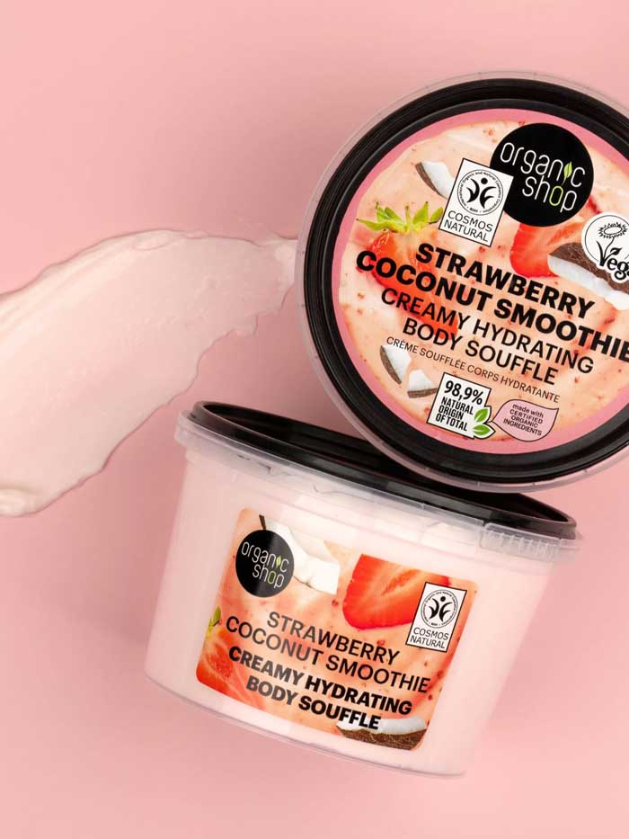 The Organic Shop Strawberry Coconut Smoothie Creamy Hydrating Body Soufflé blends hydrating vanilla milk with brightening strawberry extract for soft, smooth and beautifully scented skin. Vanilla milk delivers comforting moisture, while strawberry extract supports luminosity and a more even-looking skin tone.