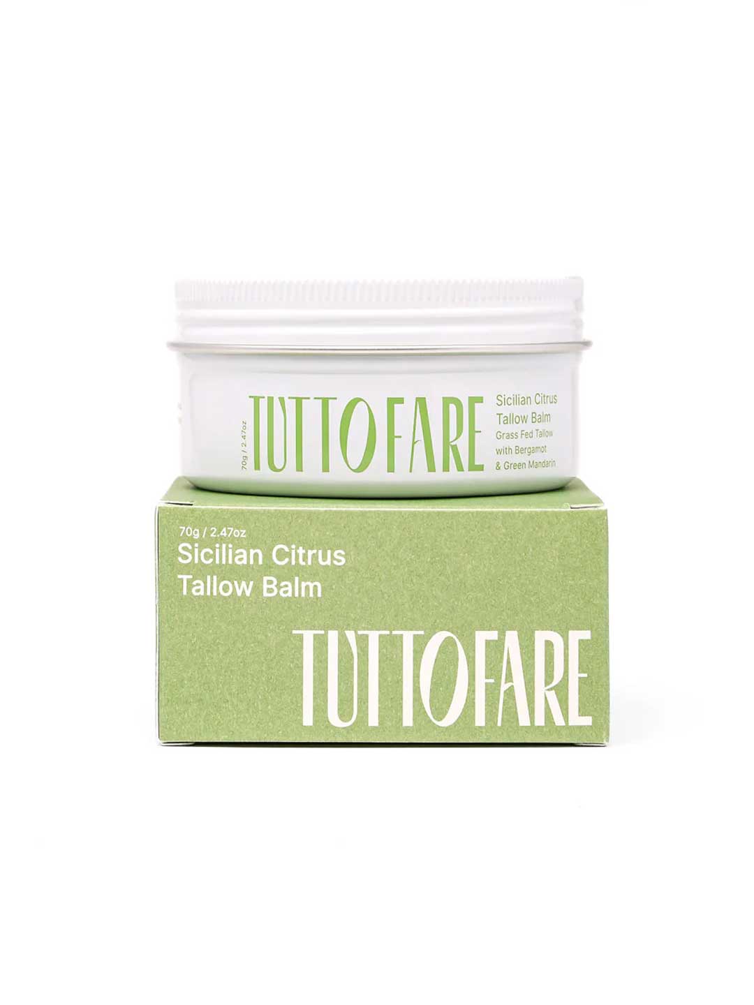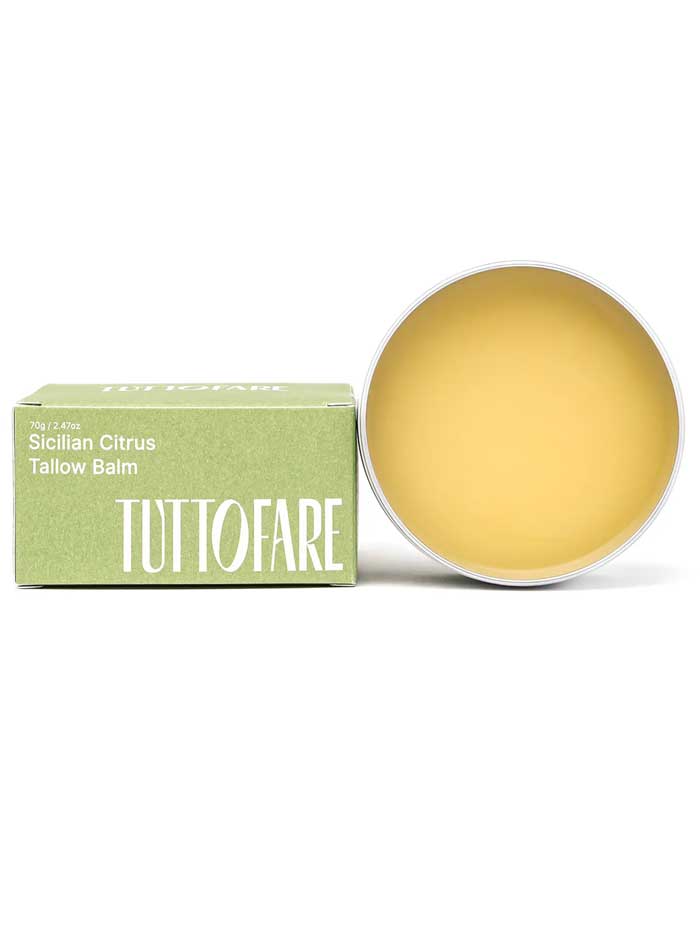 The Tuttofare Sicilian Citrus Tallow Balm is a light, fast-absorbing moisturiser for face and body with a smooth, buttery texture that melts into the skin. Made with 100% Australian Grass-Fed and Finished Beef Tallow, it delivers fatty acid-rich hydration that supports soft, balanced and radiant skin. Jojoba locks in moisture while Bisabolol helps promote a healthy-looking glow. Infused with bergaptene-free Green Tangerine and Orange Bergamot for a bright, uplifting citrus scent, this breathable balm is ideal for normal, oily or blemish-prone skin and performs beautifully in warm or humid conditions. Made in Australia and plastc free.